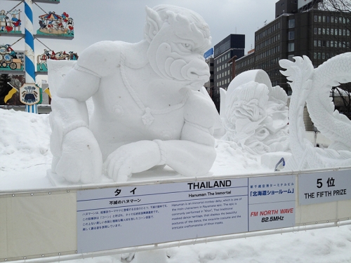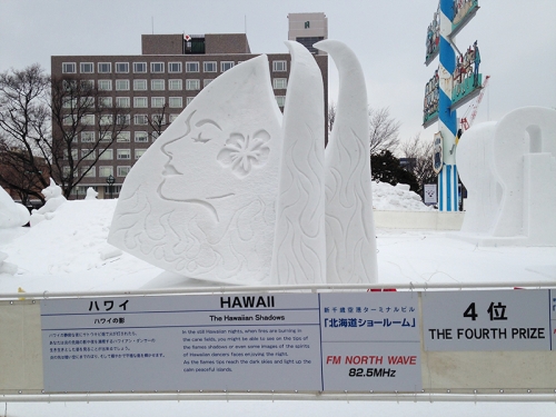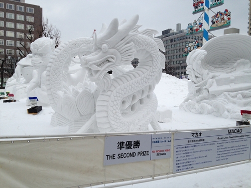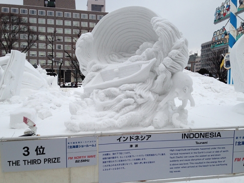 準優勝作品(写真左)はマカオの龍に抱かれた金の蓮(Golden Lotus Flower Embraced By Dragon)。他の雪像も、伝説をテーマにしたもの、メッセージを込めたものなど、それぞれの国の方々の技と感性が光っています。3位作品(写真右)は、インドネシアの津波(Tsunami)でした。