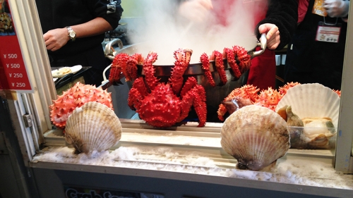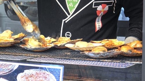 新鮮なホタテ焼き(写真左)やゆでカニ(写真中央)、熱々のシューマイ(写真右)は、どれも冷えた体にはたまりません。