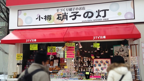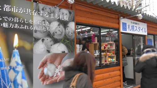 写真左は、札幌のクリエイターの作品を集めたお店で、完成度の高い素敵な商品がならんでいます。写真右は、硝子の街・小樽からの出店で、美しい色合いの硝子小物は、雪の世界とよく合います。
