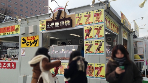 写真左は、珍しい「えぞ鹿」肉の串焼きのお店です。札幌も少しずつジビエを扱うレストランが出てきましたので、興味のある方は、例えば「札幌 ジビエ ランチ」で検索してみてくださいね。写真右は、北海道の地酒の販売所です。北海道の水もかなり美味しいので、お酒はお勧めです。甘酒も置いてありました。