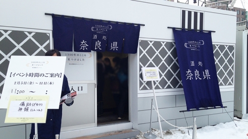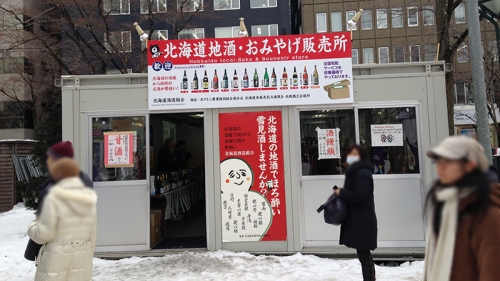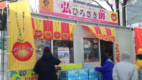 その他、全国自治体が特産品を出店していました。写真左は、奈良県のお酒の出店です。2種類のテイスティングができ、とても飲みやすいお酒でした。写真右は、弘前のお店で、主に特産であるリンゴを使ったお菓子を販売していました。他にも、多くの出店がありましたので、札幌1カ所にいながら、全国各地を回っている気分になれます。
