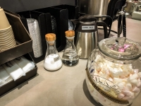 写真:トラベルライター 期間限定のメニューも♪ |  写真:トラベルライター 夏季限定のチョコレートシェイク(12oz (355ml) ¥540 + 税) |  写真:トラベルライター シュガーやミルクの他に、「マシュマロ」もセルフで入れることができるんです |