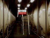 写真:トラベルライター 屋外にある発酵タンク |  写真:トラベルライター 床には発酵タンクの半径が表示 |  写真:トラベルライター 貯蔵室 |