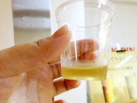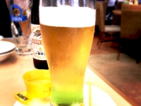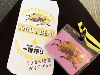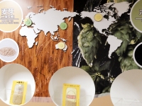 写真:トラベルライター おつまみと試飲の「新一番搾り(グラス)」と、飲み比べ用の「一番搾り(カップ)」 |  写真:トラベルライター 麦芽とホップの生産地がわかるマップ | |