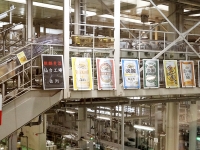 写真:トラベルライター 缶や瓶詰を行うライン |  写真:トラベルライター 左)缶入りの歴代ラベルコースター 右)ミニキリンケース |  写真:トラベルライター 工場限定スイーツ |