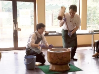 写真:トラベルライター アグリエの森店内 お餅つき |  写真:トラベルライター 一番搾りツートン<生> 一番搾り×ライム |  写真:トラベルライター ツルの長さは5mにもなるそうです |