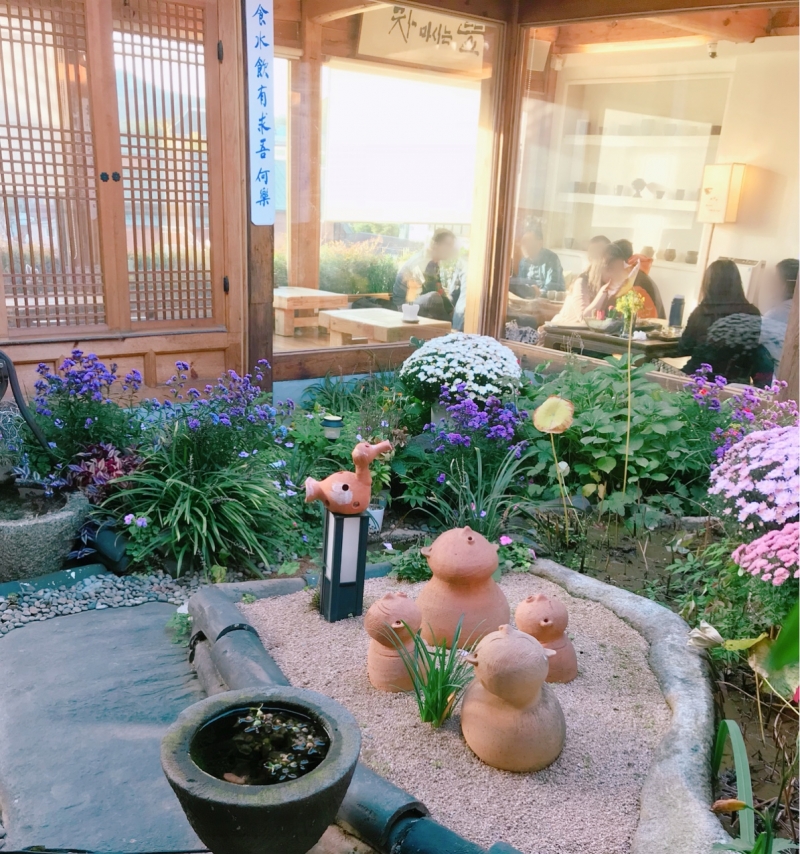 「チャマシヌントゥル」は、三清洞に位置し高台にあります。高台なので坂道がありますが、外国人観光客や地元の方にも人気の場所になっています。お店は伝統的な家屋の作りになっていて、建物の中心には庭があり、花を見ながらお茶を楽しむことができます。