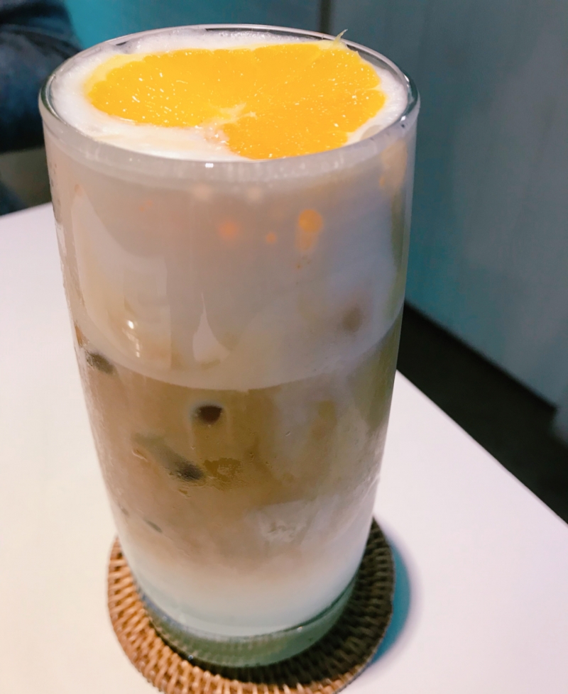 見た目もかわいいバニラスカイラテは、下は水色のバニラソースに、上はラテになっています。トッピングにオレンジがのっていてさわやかな見た目。