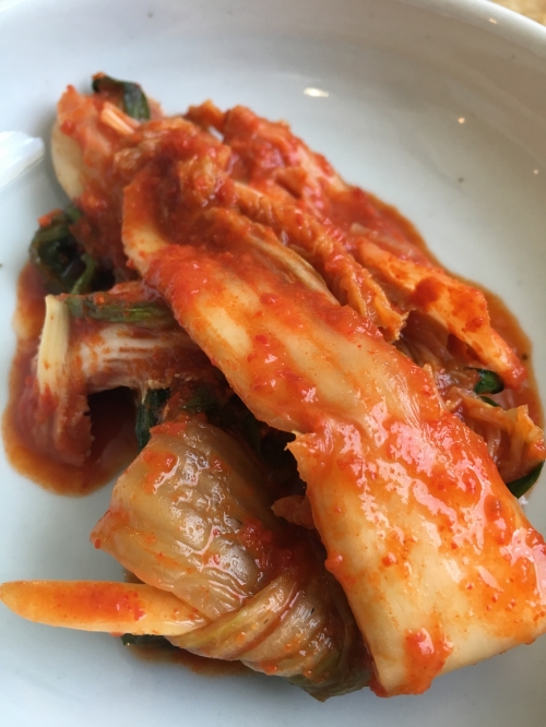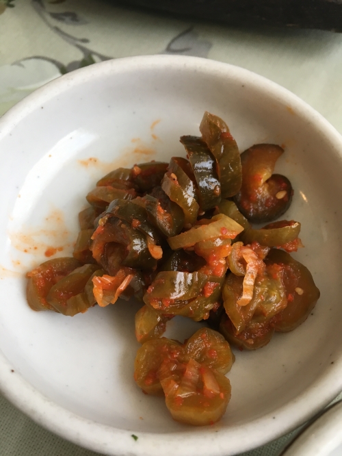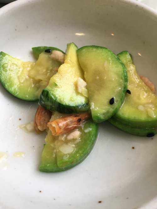 王道のキムチは酸味がクセになります。瓜と小エビの和え物は、塩気が程よく、気温が高い夏場にはぴったりの一品でした。