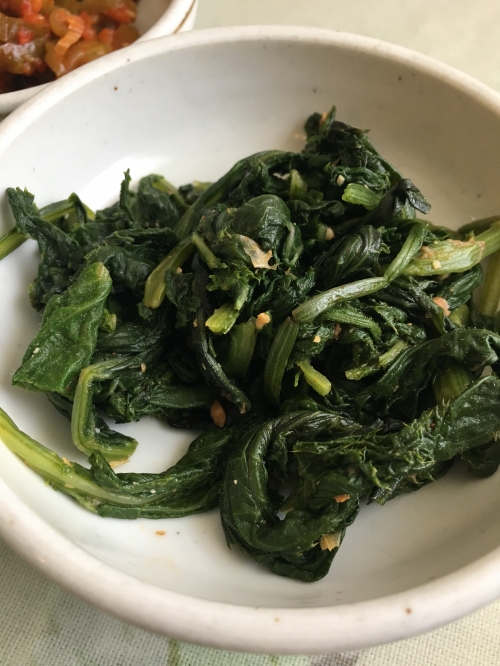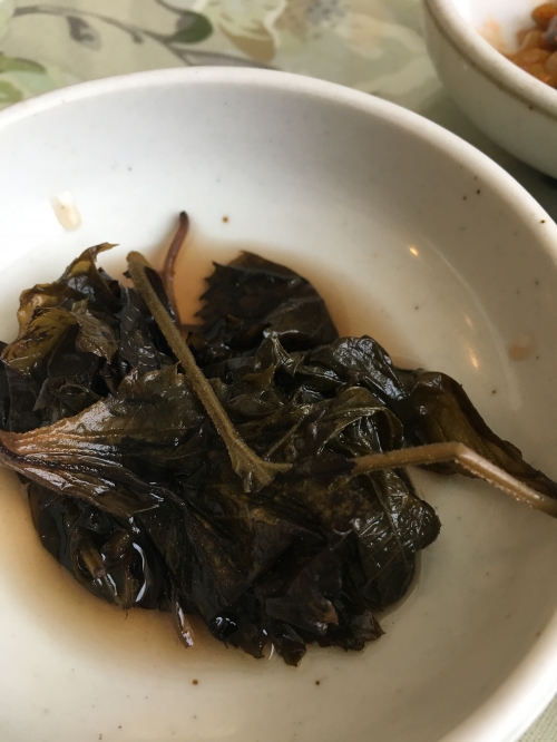 菜っ葉の和え物は、ざらざらした舌触りで、ホウレンソウと似た食感。軽く味噌のような味付けがされており、食べやすいです。お漬物は日本のものと似ており、箸休めにぴったりです。