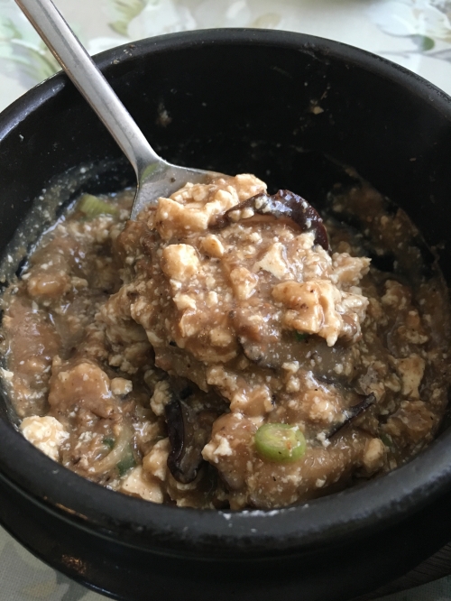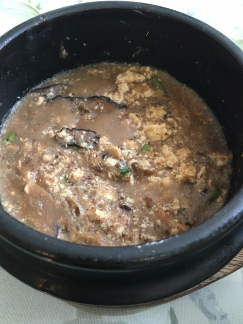 韓国味噌ソースをかけて頂きます。とろみがある味噌ソースの中には、お豆腐やキノコがふんだんに入っています。