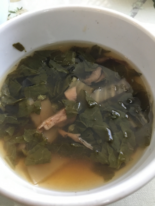メインと一緒にスープもついてきます。しいたけと菜っ葉がたくさん入ったスープでした。
