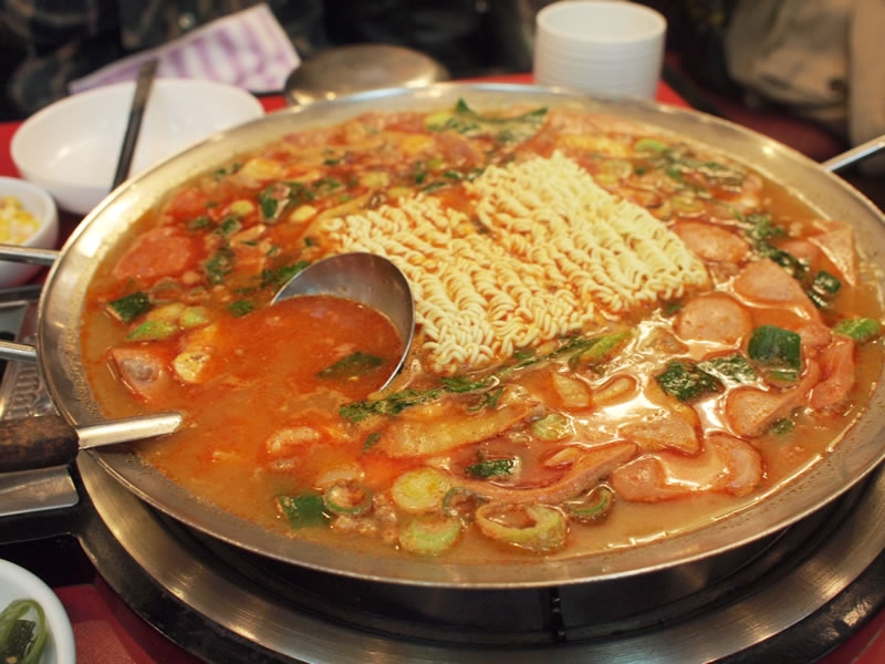 とってもジャンクな鍋で、お肉や野菜、豆腐にソーセージやスパムなどがはいり、インスタントラーメン(別注が多い)を入れて楽しむのが定番。