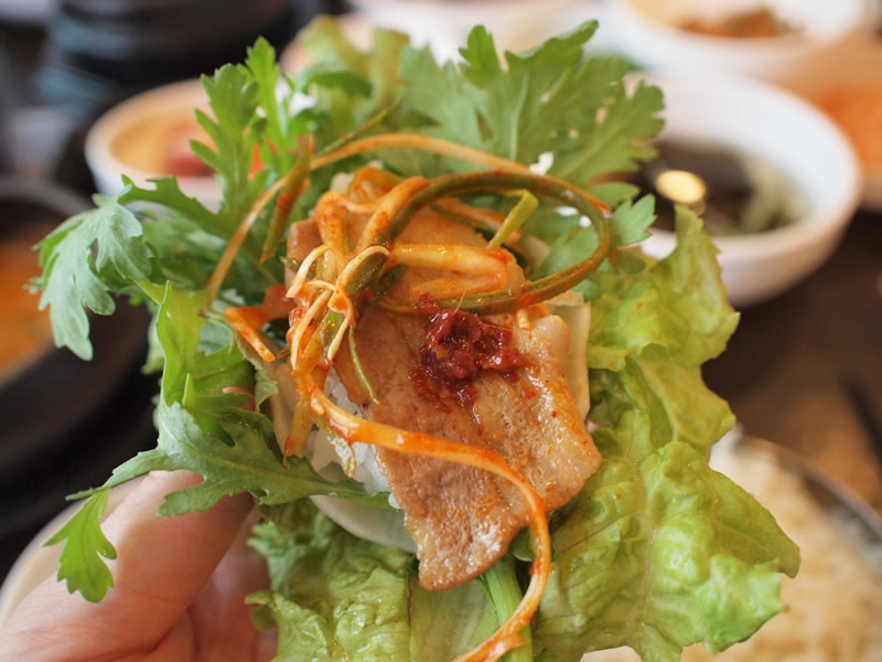 たいていは、サンチュやエゴマの葉っぱ(エゴマの葉は好き嫌いが分かれるところ・・・)に豚肉を乗せて、ネギなどの野菜や焼いたキムチ、そしてタレを乗せて巻いて食べます。