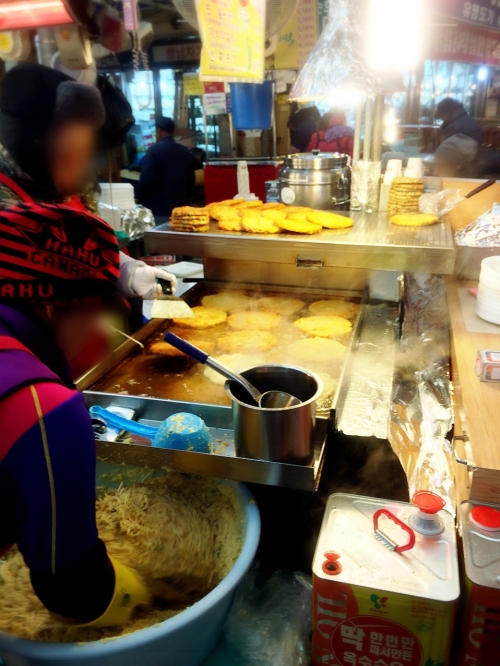 市場内のおすすめのお店は、クセになるほど美味しい一口サイズのキンパを売る「元祖麻薬キムパッ」や、外側カリっと美味しいピンデトッがいただける「スニネピンデトッ」など。店先にイートインスペースが用意されているお店もあり、落ち着いて食べることもできます。