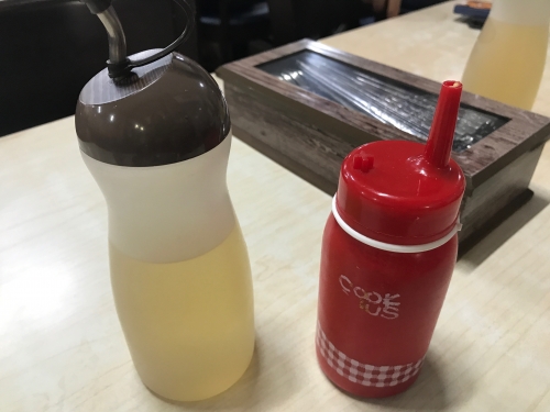 筆者が写真を撮るのを待ってから、食べやすいように麺にハサミを入れてくれました。好みでお酢やカラシも使っていただきます。おかわり自由のキムチ付きです。