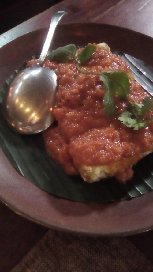 写真左は海老すり身の揚げ物です。香草入りのソースに付けて頂きます。サッパリとしたソースと相性抜群のすり身の外はカリカリ、中はモチモチでとても美味しいです。写真右は茄子のトマトソースがけです。甘みのあるソースで食べやすく、とてもヘルシーな一品です。
