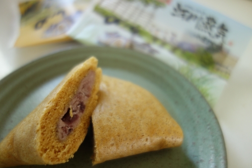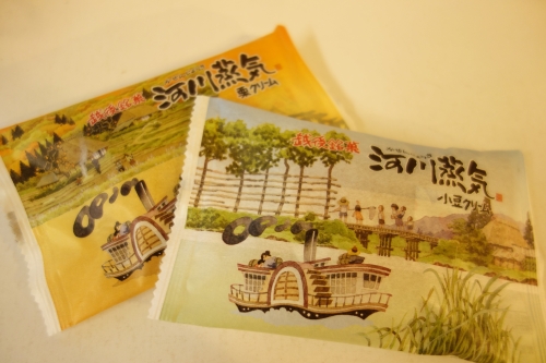 お菓子の博覧会などでも数々の受賞歴があり、テレビ番組『シルシルミシルさんデー』の「全日本隠れたお土産お菓子」でグランプリを受賞したこともある菜菓亭(さいかてい)の河川蒸気。蒸しカステラで小豆クリームをくるんだもので、しっとりとして、優しい甘さのお菓子です。秋限定で小豆クリームの代わりに栗クリームの販売もあります。