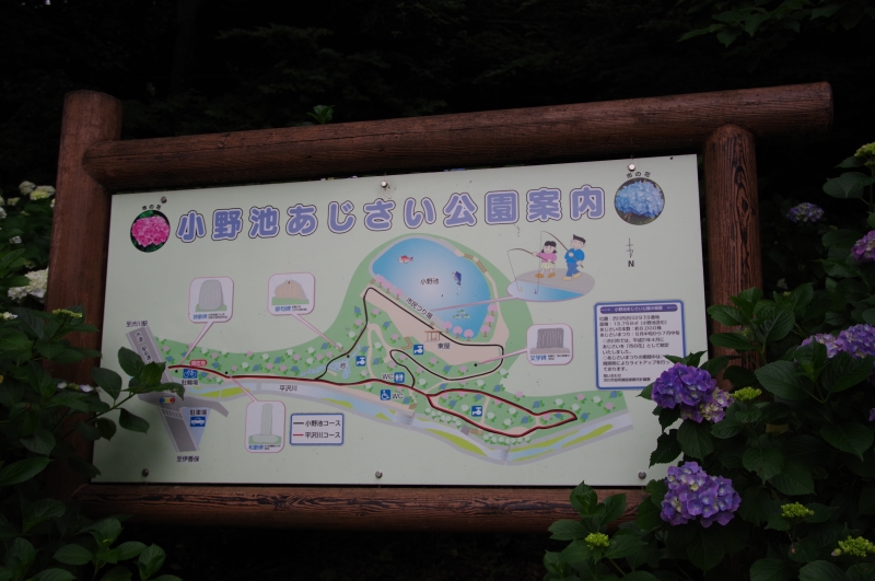 群馬県渋川市に位置する「小野池あじさい公園」は、公園はおよそ13,800平方メートルの敷地を持ち、山の斜面に沿って整備されています。丘陵地の頂上付近にある小野池を中心に、平沢川沿いに紫陽花が植えられており、散策しながら色とりどりの花々を楽しむことができます。公園からほど近い場所に専用の無料駐車場があるので、そこに車をとめてアクセスできます。