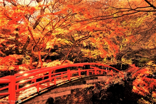 紅葉スポットとして名高い、伊香保温泉にある橋。朱色の太鼓橋と紅葉の景色は絶景で、夜にはライトアップも行われます。付近には、鮎の塩焼き(¥500)などが頂ける趣のあるお茶屋もあります。