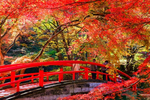 伊香保温泉街から源泉地へ向かう、湯元通り。自然豊かな散策道には木々の中に色を差す、朱色の太鼓橋「河鹿橋」があり、伊香保温泉随一のフォトスポットとなっています。例年紅葉の時期に合わせてライトアップされ、伊香保の秋の風物詩としても有名です。