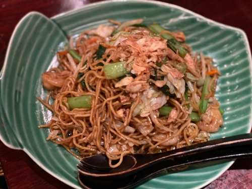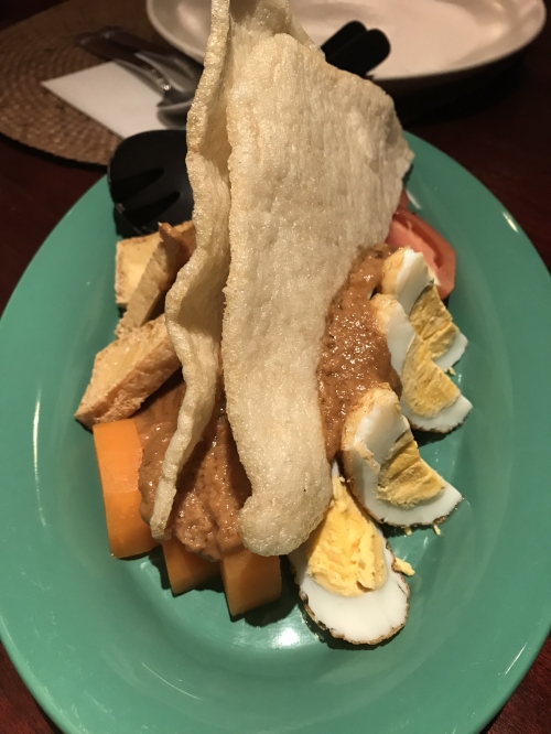 一番人気は、タレに漬け込んで焼いた串焼きのサテ。チキン、マトン、ビーフ(各¥980)の他に海老(¥1,290)もあります。ピーナッツソースをたっぷり付けて頂きましょう。茹でた野菜にピーナッツソースがかかったガドガド(¥1,190)は、インドネシアで一番人気のサラダ。えびせんを砕いて、混ぜて頂きましょう。
