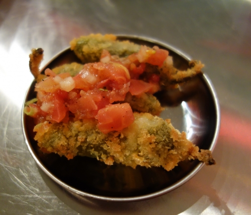 メキシコで人気のクリームチーズ入り揚げハラペーニョ(¥450)は、辛い青唐辛子ハラペーニョの中にクリームチーズを入れて揚げた物。クリームチーズが溶けて、熱々なので火傷に気をつけましょう。