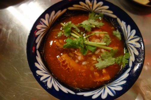 牛ハチノスと豚軟骨のメキシコ風モツ煮込み(¥380)は、内臓特有の臭みは全くなく、柔らかいので内臓嫌いな人でも食べられてしまいます。また、値段の安さにも驚き!