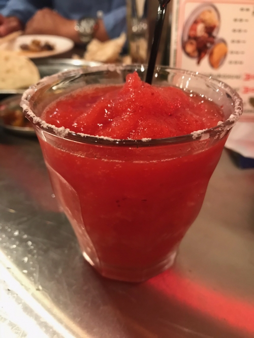 メキシコのカクテルで有名なのが、フローズンマルガリータ。ライム、マンゴー、イチゴ、ミックスがあります。また、サイズがグラス、デキャンタ、どデキャンタ(¥550~3,200)の3種類があるんです。人数が多ければ、どデキャンタがお得。