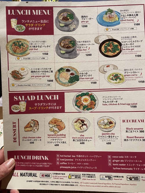 メインは、タイの焼きそばパッタイ、ガパオ、フォーガー、カレーヌードルのカオソーイ、カオマンガイ、汁なし中華麺バミーへーン、ココナッツミルク・スープトムカーガイ、グリーンカレーと豊富なラインナップから選べます。