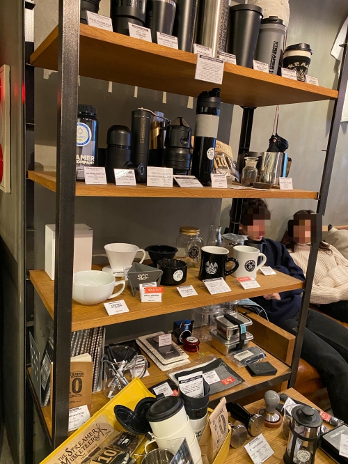 コーヒーのお供にオーダーしたいのが、シュガードーナツ(¥390)やチョコチップ・クッキー(¥310)。カウンター横には、コーヒー豆からドリップ用品、コーヒーボトルなども販売しているので、チェックしてみましょう。