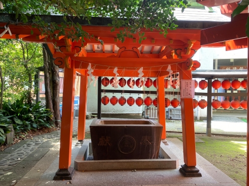 金王八幡宮の道路を挟んだ場所にあり、奉納鳥居が美しく写真映えするスポットとして人気。鳥居だけでなく、手水舎も珍しい赤色なんです。