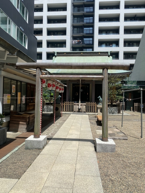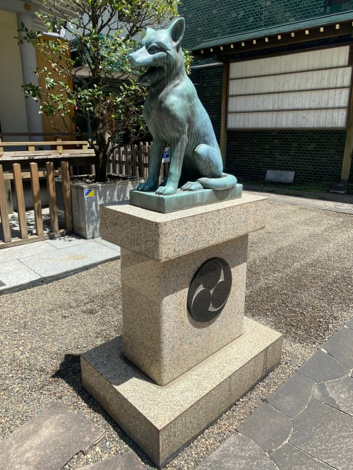 ビルの谷間にある宮益御嶽神社の狛犬は、なんと日本狼!とても珍しい狼の狛犬を目当てに訪れる参拝者もいるほどで、御朱印にも日本狼が押されています。また、11月には酉の市が開催され、熊手を求める人でも賑わいます。