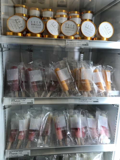 TRUNK オリジナルのオーガニックシャンプー、コンディショナーから、保存料、着色料、砂糖を一切使わない自然の素材の味が楽しめるアイスキャンデー(¥350)、オーガニックアイス(¥700)など、健康や環境にこだわったオリジナルの商品が購入できます。また、店の外にはテラス席があるので、気軽にそこで飲食出来るんです。