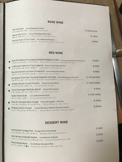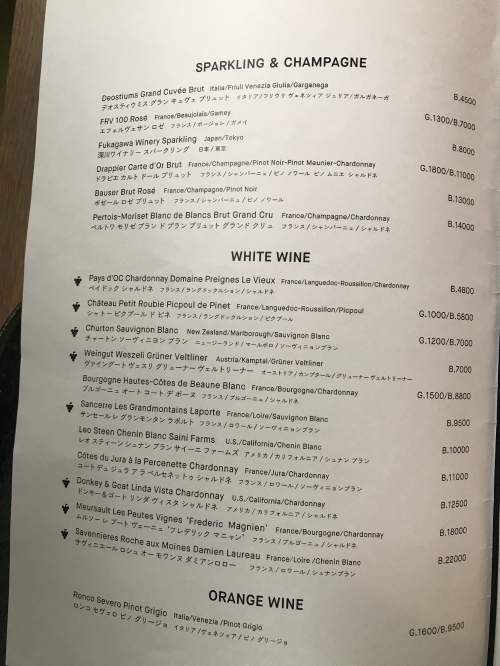 中でもおすすめは、東京・深川産のスパークリング(¥8,000)や、オレンジワイン(¥9,500・グラス¥1,600)。他では、中々味わえないので、是非、試してみましょう。