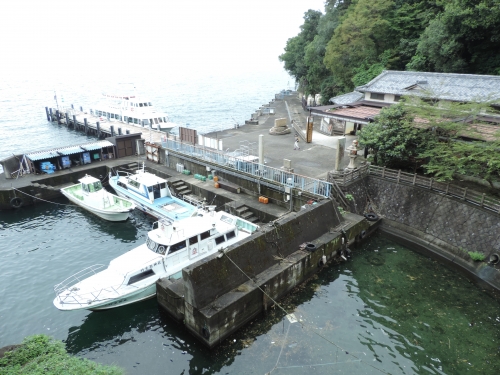 「竹生島」には、長浜港(往復乗船料:3,070円)、彦根港(往復乗船料:3,000円)、今津港(往復乗船料:2,590円)の3港から渡ることができ、各港とも1日4~5便(季節などにより変更あり)運行されているので、アクセスしやすい島でもあります。また、旅のプランによっては今津港→竹生島→長浜港と船で移動する事も可能です。