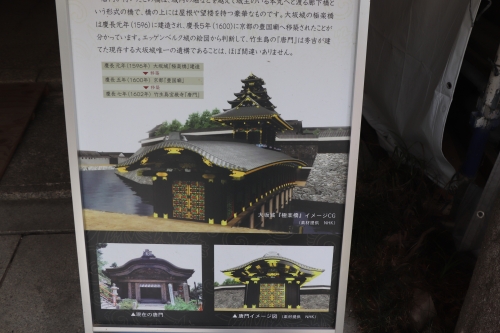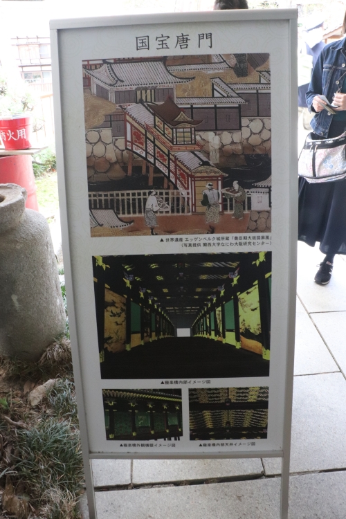 平成18年オーストリアのエッゲンベルク城で豊臣期大坂図屏風が発見され、その中にはこの唐門が付いた極楽橋が描かれていました。極楽橋は大坂城本丸の北方にかけられていた豪華な橋で、1600年豊臣廟へ移築されたことがわかっています。屏風の絵図からも判断してこの唐門は元々大坂城にあったものであり、現存する大坂城唯一の遺構であることは間違いないとされています。