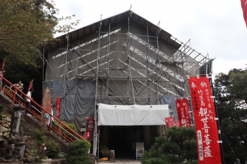 平成25年から、唐門をはじめ観音堂などは修復工事されており、残念ながら現在はその遺構を見ることができません。(修復工事は平成31年3月31日までの予定)修復工事が終わり新たに葺き替えられた檜皮葺屋根や、塗り直された堂内の絵図が見られるのを楽しみに待ちましょう。なお、工事期間中も門に続く観音堂への拝観は可能です。