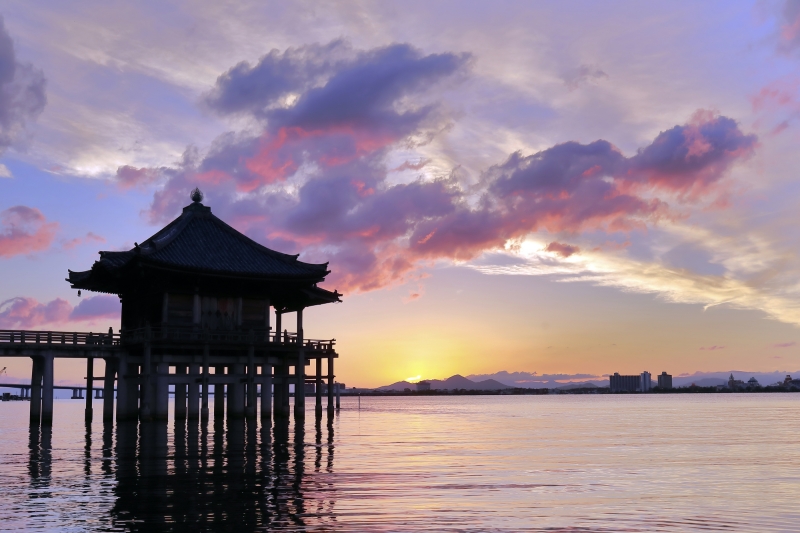 白髭神社から国道161号線を走ること約30分、湖上に浮かぶ美しいお堂・浮御堂に到着します。室町時代末期に選定された近江八景の一つ「堅田の落雁(かたたのらくがん)」で知られる景勝地で、海門山満月寺のお堂です。