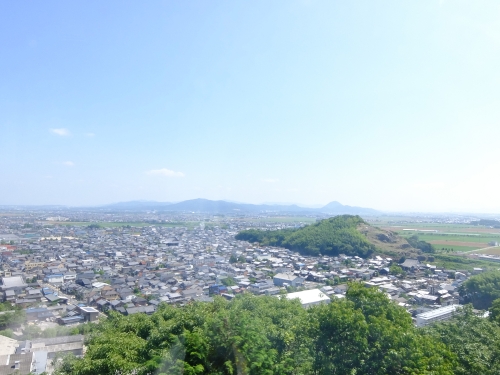 北の丸跡からは、西の湖や織田信長が築いた安土城跡がある安土山が見えます。八幡山城は南の平野部に城下町があり、安土城と類似した形状となっています。