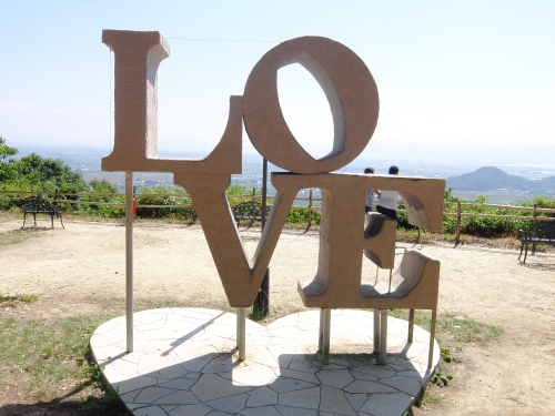 西の丸跡には大きなLOVEオブジェ。北の丸跡には、ハート型のモニュメントがあります。