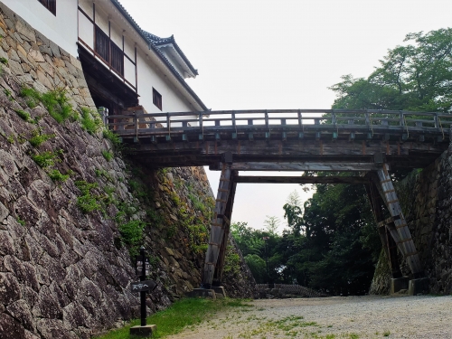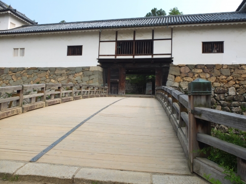 表門と大手門が合流する位置に建つ天秤櫓。廊下橋を中央に天秤のように、左右対称であることから天秤櫓と呼ばれました。これは、長浜城の大手門を移築したとされています。廊下橋は、非常時には、落とし橋となって敵の侵入を防ぐ働きがありました。
