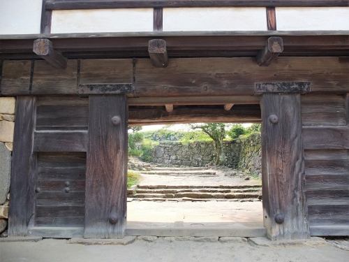場所によっては、10m以上にも及ぶ高い石垣が築かれており、その傾斜や高さは、美しささえ感じられるほど見事です。胴長の石を重ねた牛蒡(ごぼう)積みは、大変強固なもので、建城当時の積み方です。江戸後期の改修では、石が斜めに重ねられる落とし積みとなっています。