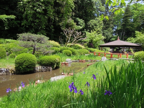 無憂園は、びわ湖をかたどった池のある回遊式庭園です。池の周囲では、新緑の季節からアヤメ、キショウブ、花しょうぶといった花々が咲き、静かな庭園に彩りを添えます。小さな滝や東屋もあり、雰囲気が良いので、花の季節にはぜひ立ち寄ってみてください。