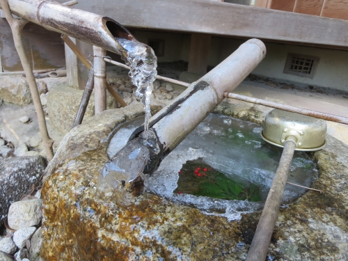 『幻住庵記』に「たまたま心まめなる時は、谷の清水を汲みてみづから炊く。とくとくの雫を佗て、一炉の備へいとかろし」と述べられている清水で、飲めないようですが、今でも澄んだ清らかな水が湧き出ていて、ここからせせらぎが流れています。