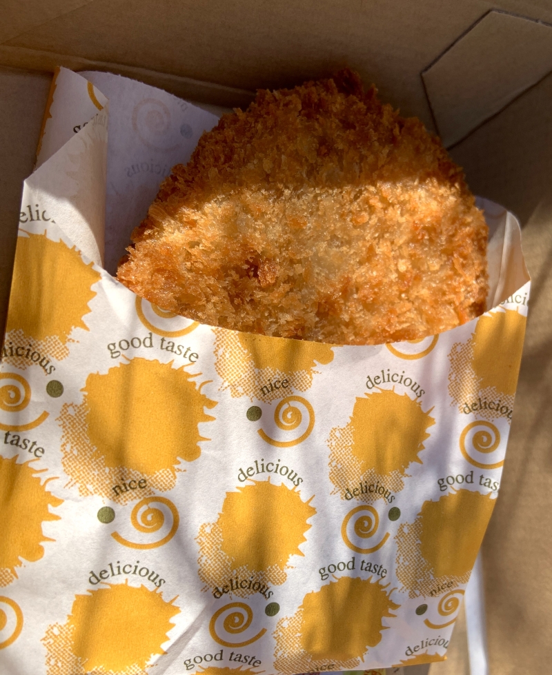 こちらは、近江牛コロッケ(300円)です。サクッと揚がったコロッケは、ジャガイモのホクホク感が感じられます。また、少し入っている近江牛のミンチにより、香ばしさが感じられます。ちょっとお腹がすいたときに、食べてみてはいかがでしょうか。