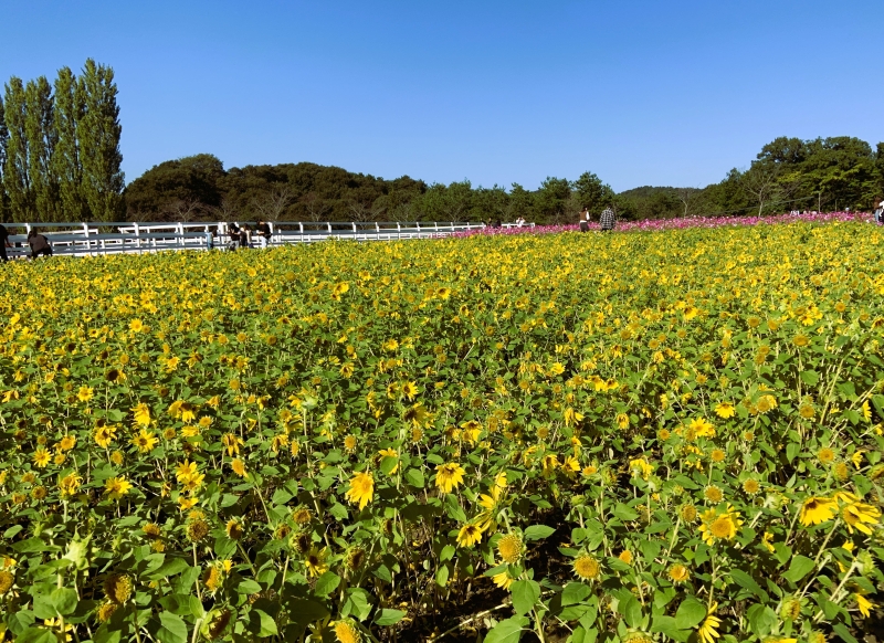 筆者が訪れた秋には、ひまわりとコスモスが咲いていました。秋のひまわりは、花はやや小さめですが、鮮やかな黄色い花がたくさん咲くと、見ごたえがあります。写真撮影をする家族連れの姿も見られます。