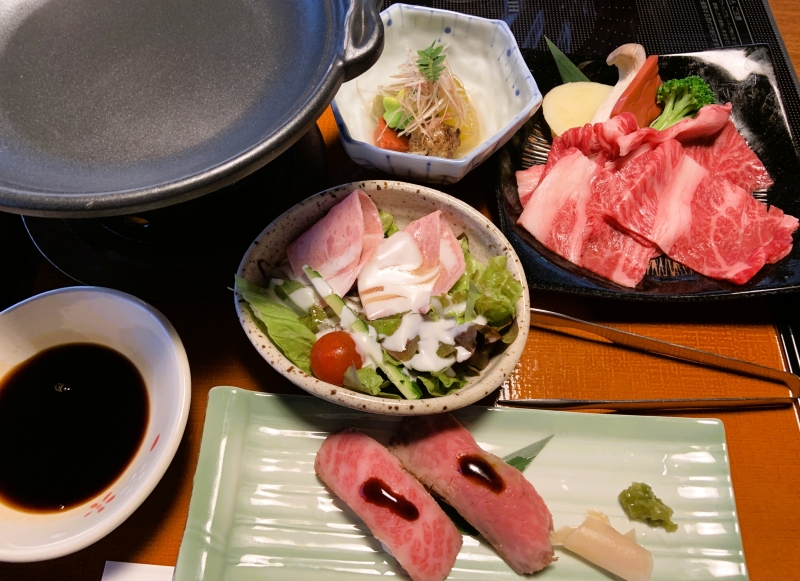旅館の夕食やレストランでは、ステーキやすき焼き、しゃぶしゃぶなどで味わえます。希少なブランド牛のため、ディナーやコース料理では1万円以上するお店もありますが、ランチでは、3,000円程度から用意されているので、気軽に極上の風味を味わうことができます。