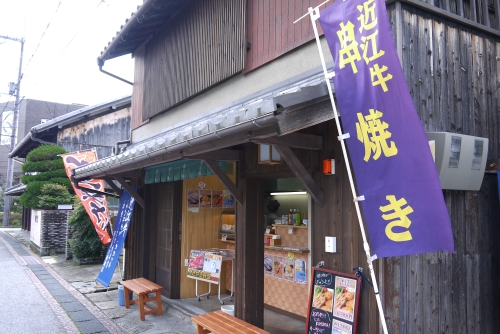 八幡堀の近くのお店で、近江牛の串焼きを販売しています。注文してから焼いてくれる近江牛は、とってもジューシーです。