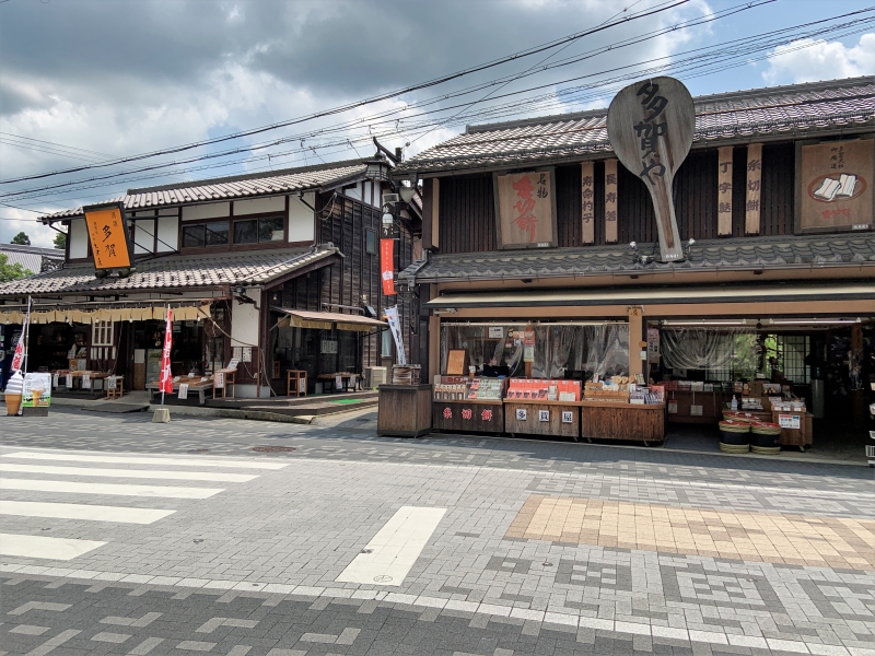 多賀大社の前まで来ると、飲食店、土産物店が立ち並んでいます。地酒や銘菓が店に並び、参拝者がお土産を選んでいる姿が見られます。多賀名物の和菓子「糸切餅」も販売しており、お茶とともにいただける店もあります。
